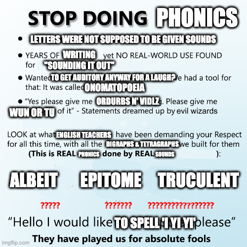 phonics are only remotely useful between kindergarten and second grade, after that they are a hindrance as the child should be actually learning how to read. Phonics is bullshit and trying to reuse hearing for reading instead of treating reading as a similar but independent idea. How many people that grew up with phonics can read and hold a conversion?