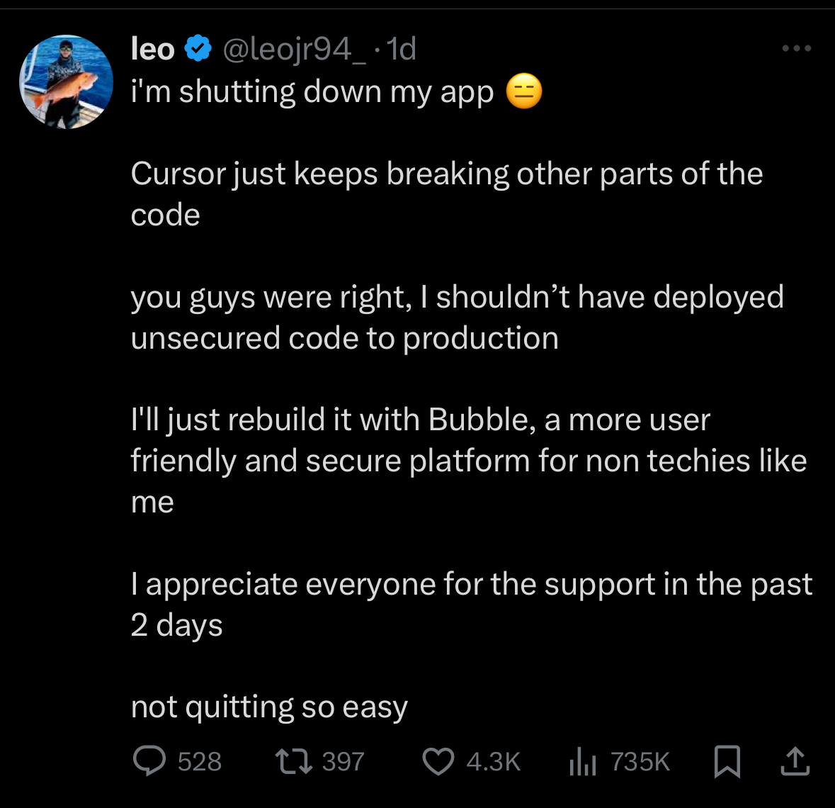 A newbie without a leash just pushing whatever an AI hands them into production. O, boy, are senior programmers going to be sad for a long, long time.