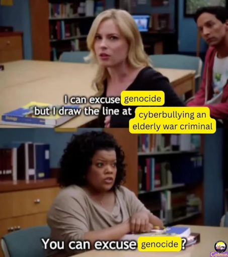 Okay, but then if we point our finger at your face and call you a genocide supporter, you shut up and take it right?! Right?
