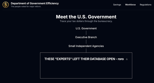 The doge[.]gov website that was spun up to track Elon Musk’s cuts to the federal government is insecure and pulls from a database that can be edited by anyone, according to two separate people who found the vulnerability and shared it with 404 Media. One coder added at least two database entries that are visible on the live site and say “this is a joke of a .gov site” and “THESE ‘EXPERTS’ LEFT THEIR DATABASE OPEN -roro.”