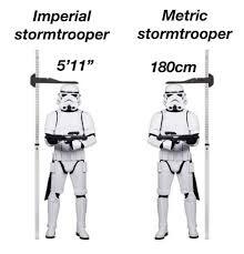 The Metric Stormtrooper is taller because a pound of centimeters is heavier than a pound of inches.