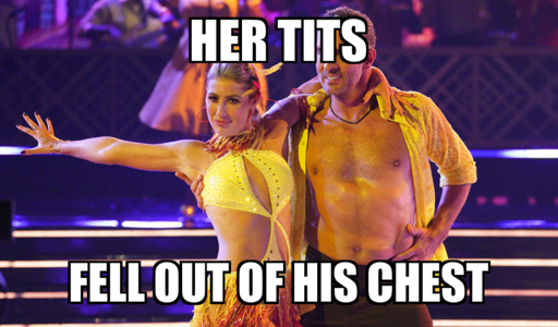 This is a screenshot from the show Dancing With The Stars, at the end of their dance. I’m sure their dance was awesome, but why do I want to see dude’s hairy chest at the end? Many fellas out there might have preferred if her tits popped out, not his.