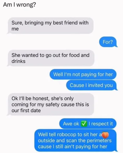 Do you all have a different idea of what a date is than me or something? The point is to get to know someone you don’t know yet. I guess if you were communicating for weeks beforehand this might seem weird, but that’s making some big assumptions. You’re acting like this woman has requested her friend accompany her for every moment of their ongoing relationship. It’s wild to me to get so insecure about someone not fully trusting you this first time you meet. Trust is built over time, and it’s not a slight against you if someone wants to protect themselves.