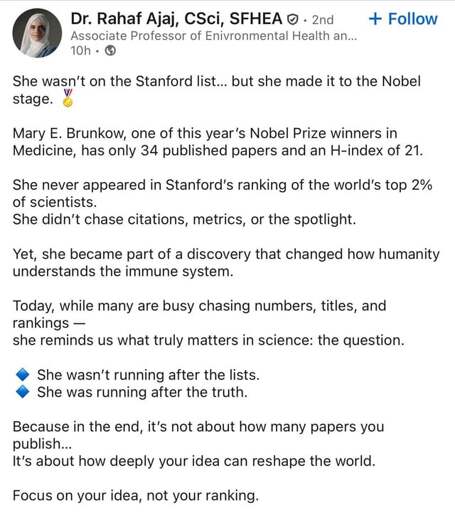 arrow-up1732arrow-down1imageMary E. Brunkow, one of this year's Nobel Prize winners in Medicine, has only 34 published papers and an H-index of 21.mander.xyzfossilesque@mander.xyzM to Science Memes@mander.xyzEnglish · 7 days agomessage-square78linkfedilink