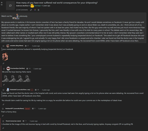 arrow-up126arrow-down1imageUnemployed Tankie threatens his wife's job as a nurse because he was trolling a doctor who had covidsh.itjust.worksgoat@sh.itjust.worksM to MeanwhileOnGrad@sh.itjust.worksEnglish · 2 months agomessage-square7linkfedilink