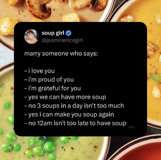 minus-squareParadoxSeahorse@lemmy.worldlinkfedilinkarrow-up20·2 months agomarry someone who says: i love you i’m proud of you i’m grateful for you yes we can have more jasmine rice no 3 rice in a day isn’t too much yes i can make you jasmine rice again no 12am isn’t too late to have jasmine rice