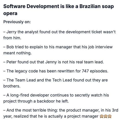 arrow-up174arrow-down1imageSoftware Development is like a Brazilian soap operalemmy.ml☆ Yσɠƚԋσʂ ☆@lemmy.ml to Programmer Humor@lemmy.mlEnglish · 26 days agomessage-square4linkfedilinkcross-posted to: funny@sh.itjust.works