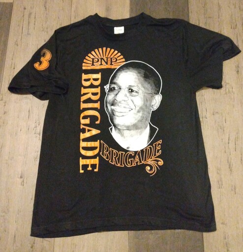 Pretty sure that’s Andrew Holness but it looks like he’s JLP not PNP. Now I’m confused. He was PM of Jamaica for three months at the end of 2011. An election was held at that point and the PNP won, displacing him. Perhaps that was a shirt PNP supporters at the time were using to rally the troops, or a shirt printed afterwards to mock him for only being in for 3 months… I have no idea. I fell down this rabbit hole and I honestly can’t find my way out. Just gonna go with the flow my lil ADD adventure.