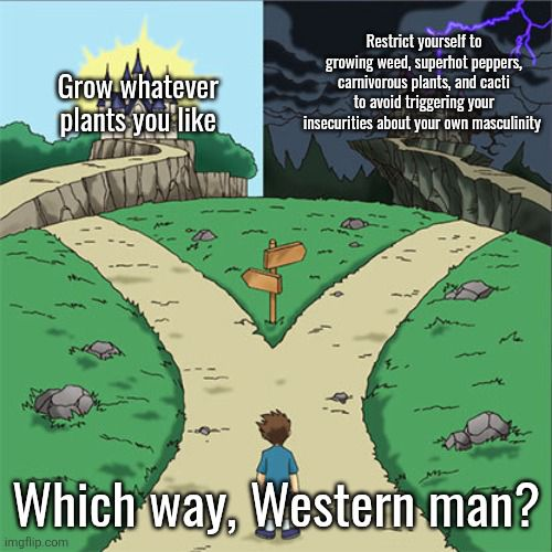 Same, I don’t know any dudes into gardening that care about that shit. One of them does grow peppers, but it’s because he likes peppers, not because he’s worried growing other stuff (which he also does) will make him look like a pussy.