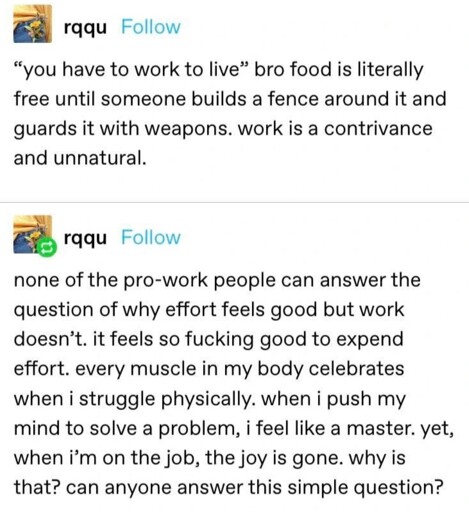 No I don’t want to go punch in for minimum wage serving coffee or work at a non employee owned factory where there give you a $1 more than minimum wage and pluck your ass at an injection molding machine. But I would, and do, work hard turning my small plot into a food garden every fucking summer, to try and remember my roots, because the effort is valuable to me, as it’s my own, and the pay off my own to share with whom I want.
