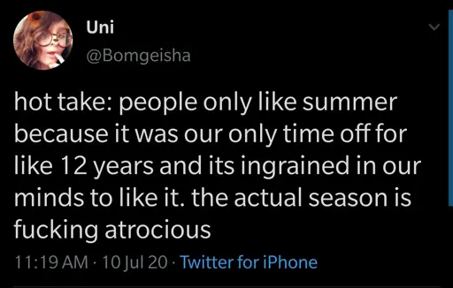 As opposed to being too hot all over and desperate for anything that gives the slightest momentary relief. Not being able stand any activity because movement just makes you hotter and the heat has sapped your will to live. Being sweaty all over no matter what you do because it’s all your body can do to keep you alive.