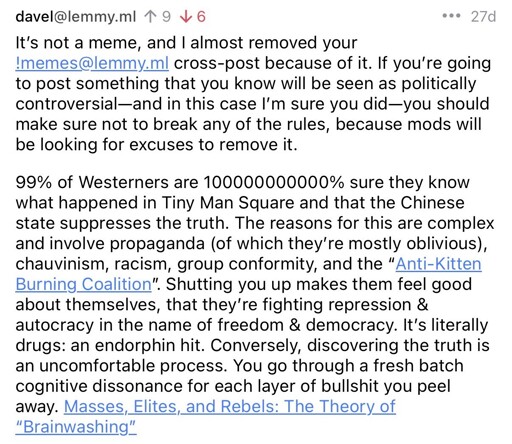 Most often these phrases are brought out to mock the person they’re replaying too. For example, before I knew that it wasn’t actually called the “Chinese Communist Party” or “CCP”, which is just what the American State Department calls them in order to make it easy to identify the allegiance of an author, I’d get a lot of “is the see see pee in the room with you now?” replies.