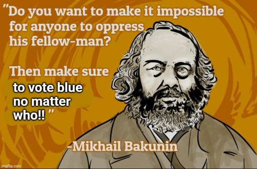 A posterized image of Mikhail Bakunin with an overlaid edited quote which reads, “Do you want to make it impossible for anyone to oppress his fellow-man? Then make sure [to vote blue no matter who!!]”