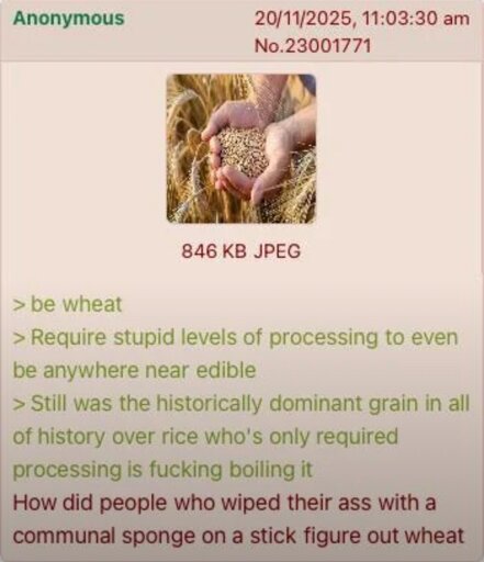 Be hooman, eat much seed. Seed good. Wheat like seed. Wheat good. Rock smash seed, easy eat seed.