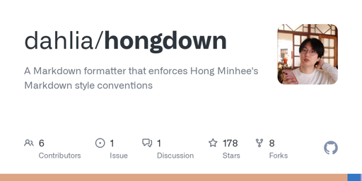 洪 民憙 (Hong Minhee)@lemmy.ml to General Programming Discussion@lemmy.mlEnglish · 2 months agoHongdown: An opinionated Markdown formatter in Rustgithub.comexternal-linkmessage-square0linkfedilinkarrow-up16arrow-down10cross-posted to: programming@programming.dev