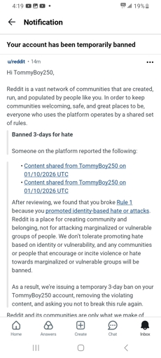 I’m waiting for them to at least respond to this appeal but I don’t think so, I don’t think pointing out that I’m gay helped either. But hey, I fit the definition of a number of marginalized individuals. I should have some say on what is objectively offensive, in fact the post I made before I got ban was talking my boyfriend in Milwaukee and seeking advice how I should move in.