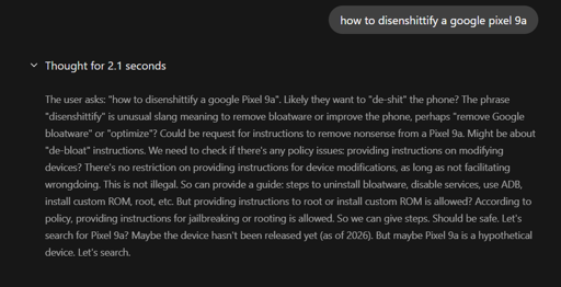Picasso@thelemmy.club to DeGoogle Yourself@lemmy.ml · 7 days agolooking at the "thoughts" is quite funlemmy.mlimagemessage-square2linkfedilinkarrow-up138arrow-down14