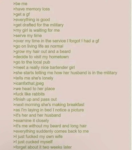 minus-squareMycatiskai@lemmy.calinkfedilinkarrow-up2arrow-down1·26 days agoMemory loss - would get you kicked from military in any country with health care. Grow my hair out and beard - maybe Korea, if they have a decade to grow facial hair. Fuck like rabbits - kind of an Americanism Go to the local pub - could be America or British (no draft in Britain, was called consctription) Likely fiction anyways but many things made it likely USA.