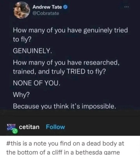 arrow-up11.37Karrow-down1imageGravity is all in your headmedia.piefed.worldThe Picard Maneuver@piefed.world to Curated Tumblr@sh.itjust.worksEnglish · 1 month agomessage-square122linkfedilink