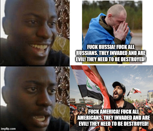 The funny thing about “hate begets more hate” is that the user you’re replying to has a good reason to feel hate, and the racist Americans on the other side of that equation don’t. And yet, between those two groups, whose hate results in millions of people dying through sanctions and warfare?