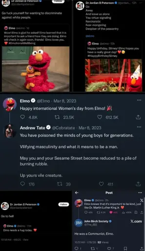 I checked and couldn’t find these posts by Peterson (and didn’t bother with Tate). Granted X is confusing, so can anyone link the actual sources? I found Elmo’s Tweets though: https://x.com/elmo/status/1909619518873149470