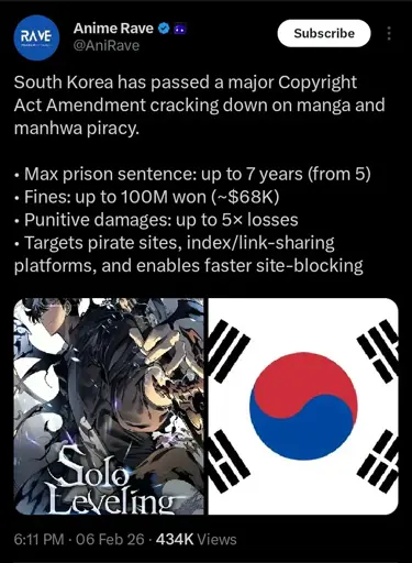 Animetosho shutting down, and now this. https://www.dexerto.com/anime/south-korea-law-targets-anime-piracy-with-penalties-for-sharing-links-3315460/