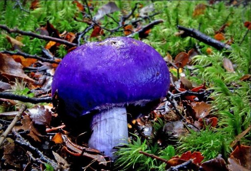The violet pouch fungus (Cortinarius porphyroideus) is a truffle-like fungus found in the leaf litter of beech forests. Its spore-producing tissue is enclosed within its purple cap. Spores are released when the cap begins to disintegrate, or when insects and other small animals eat the tissue within the cap.
