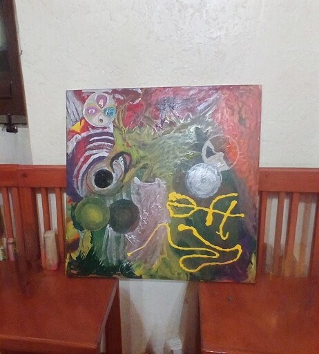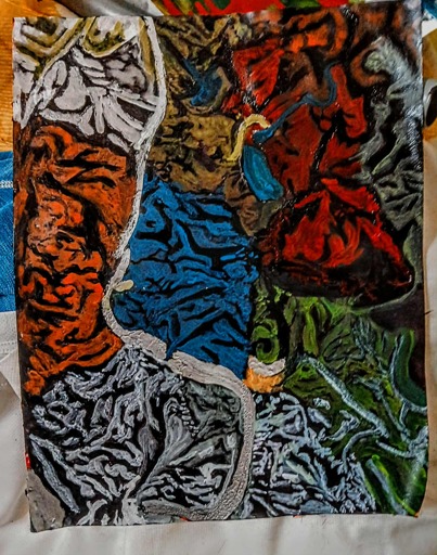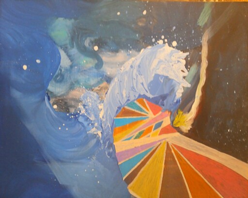 I tape off part of the canvas. I paint something, then I remove the tape and expand it so stuff looks epic.